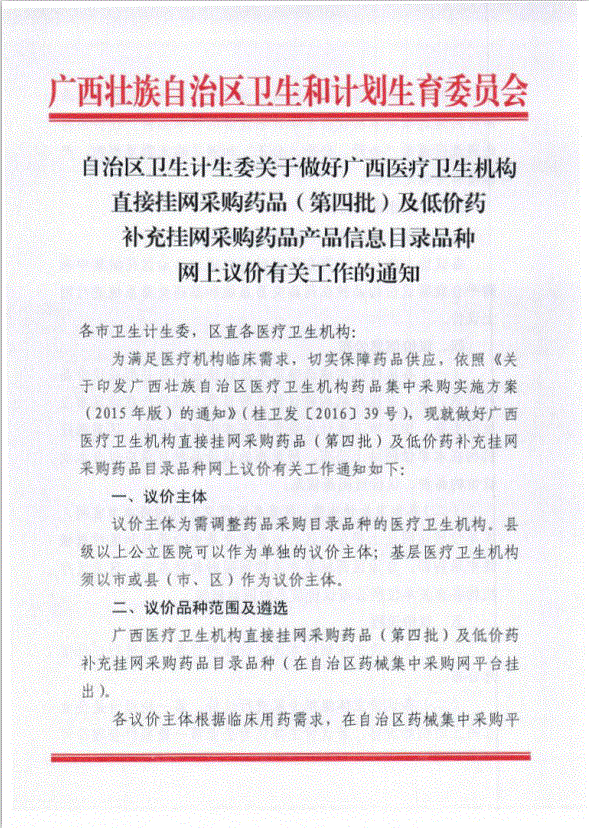 > 2018年广西壮族自治区卫生计生委关于做好广西医疗卫生机构直接挂网采购药品(第四批)及低价药补充挂网采购药品产品信息目录品种网上议价有关工作的通知