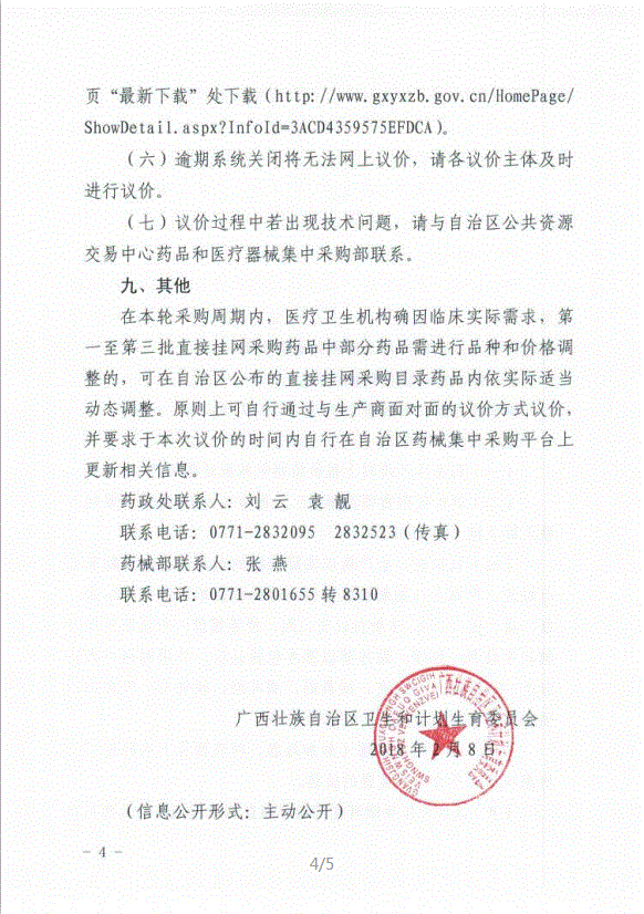 2018年广西壮族自治区卫生计生委关于做好广西医疗卫生机构直接挂网采购药品(第四批)及低价药补充挂网采购药品产品信息目录品种网上议价有关工作的通知