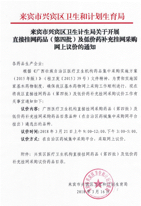 > 2018年广西壮族自治区来宾市兴宾区医疗卫生机构直接挂网药品(第四批)及低价药补充挂网采购议价通知及药品目录