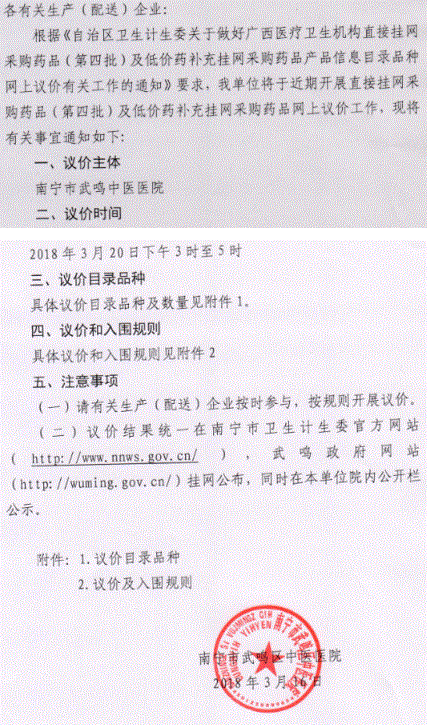> 2018年广西壮族自治区南宁市武鸣区中医医院关于开展广西医疗卫生机构直接挂网采购药品(第四批)及低价药补充挂网采购药品网上议价工作的通知