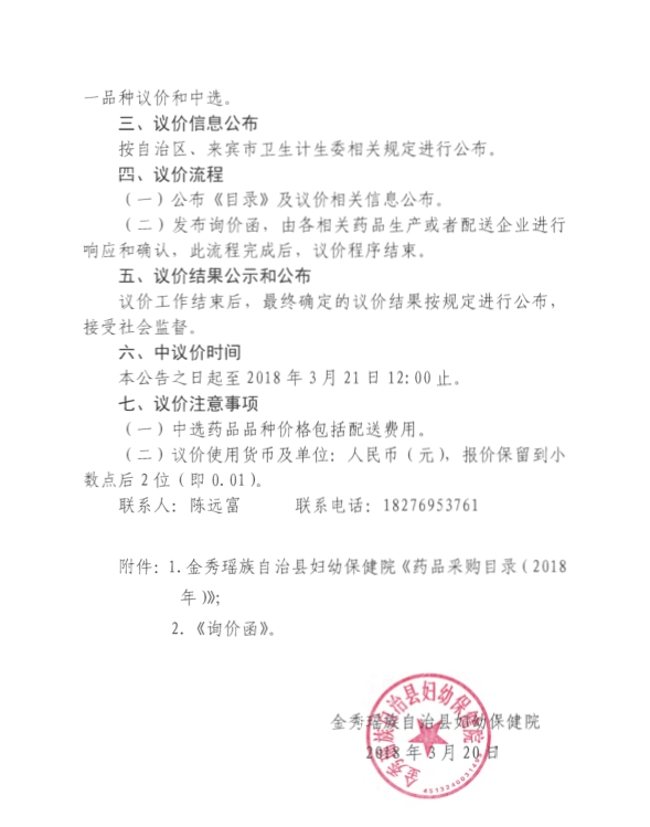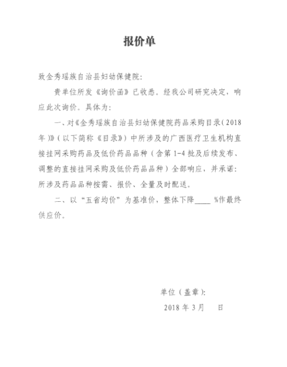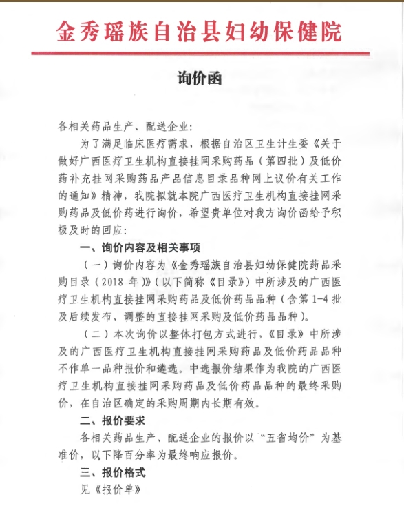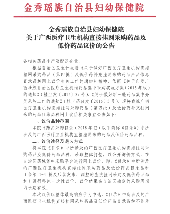 > 2018年广西壮族自治区来宾市金秀县妇幼保健院药品议价公告及目录公示