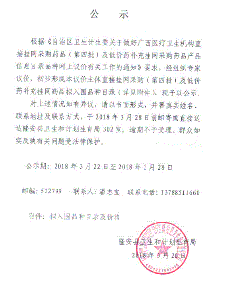 > 2018年广西壮族自治区南宁市隆安县卫生计生局关于基层医疗卫生机构直接挂网采购药品(第四批)及低价药补充挂网采购药品拟入围目录品种公示通知