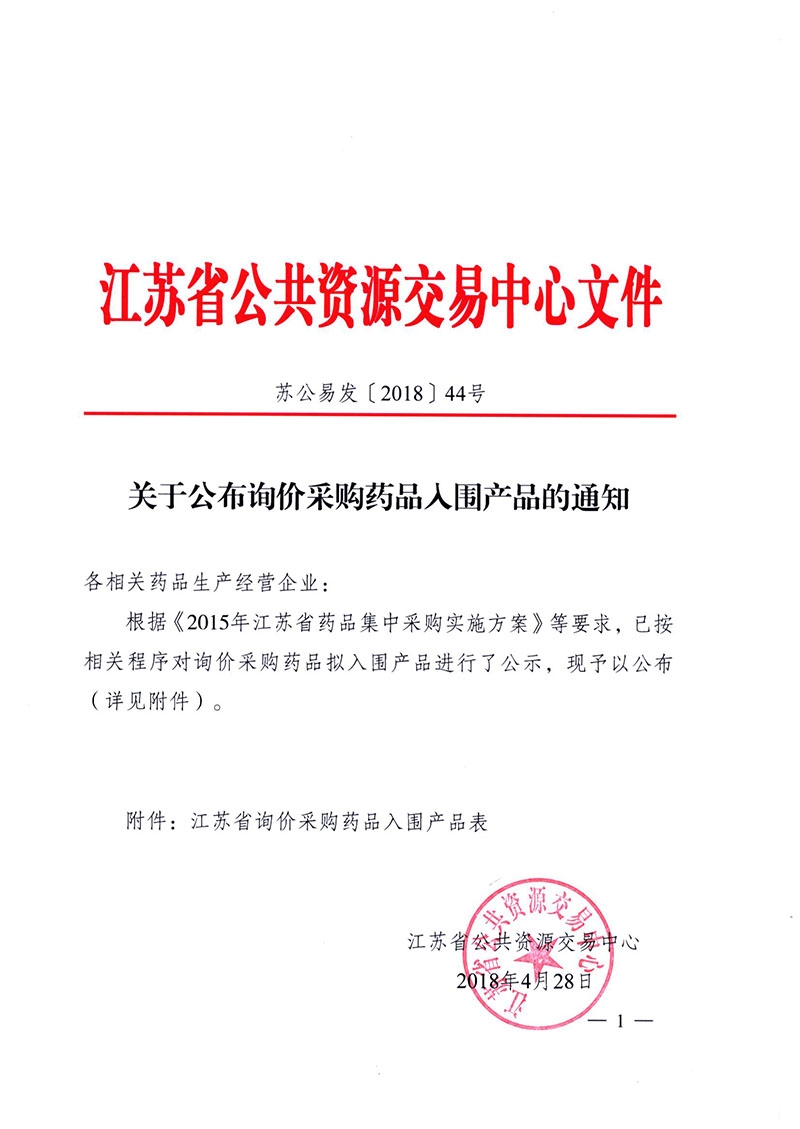 > 2018年江苏省关于公布询价采购药品入围产品的通知